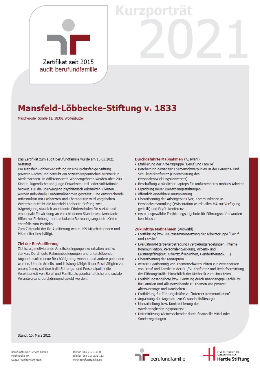 Im März 2021 wurde der MLS bereits zum dritten Mal das Zertifikat „audit berufundfamilie“ verliehen. Dieses Qualitätssiegel lässt potenzielle Arbeitnehmer*innen auf den ersten Blick erkennen, dass die Stiftung für nachhaltige familien- und lebensphasenbewusste Personalpolitik steht und ist seit seiner Einführung 1998 von führenden Wirtschaftsverbänden anerkannt.