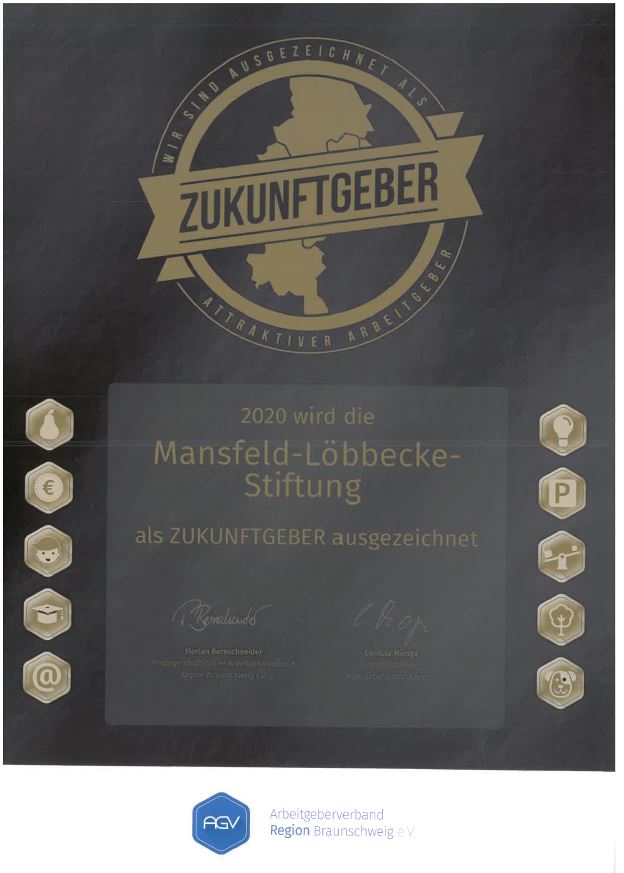 Schon vor gut zwei Jahren wurde die Mansfeld-Löbbecke-Stiftung durch den Arbeitgeberverband Braunschweig als „Zukunftgeber“ ausgezeichnet. Das Siegel bescheinigt Unternehmen der Region besonders ansprechende Arbeitsbedingungen. Kürzlich fand die offizielle Übergabe in der Klostergärtnerei Riddagshausen statt.