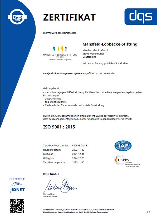 Besondere Stärken wurden der Mansfeld-Löbbecke-Stiftung in den Bereichen Wohnen und Betreuen, Schule und Bildung sowie Überwachung, Korrektur und Verbesserung bescheinigt. Zu den bei Besuchen in Wohnangeboten und Schulen gewonnenen Erkenntnissen heißt es im Bericht der DQS: „An allen Standorten wurde eine ausgeprägte Orientierung des Personals an den Bedürfnissen, Ressourcen und Potenzialen der Kinder und Jugendlichen gesehen. Der gesamte Prozess der Hilfe-/Förderplanung, die Angemessenheit ihrer Maßnahmen und die Einbeziehung des jeweiligen Umfelds und Hilfesystems ist sehr gut entwickelt.“