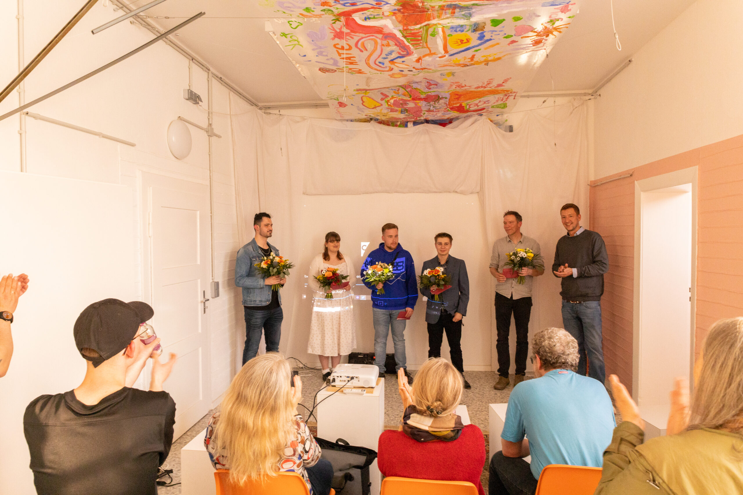 Im Anschluss an die halbstündige Filmvorführung erzählte Leon Klein von den Dreharbeiten: „Ich war wirklich überrascht, wie offen die drei mit mir über ihr Leben in der Stiftung geredet haben. Das macht den Film so besonders.“ Auch die Protagonist*innen Jannika, Moritz und Moritz waren sichtlich zufrieden und freuten sich über die Anerkennung, als Till Ruhe ihnen im Namen des Vorstands gratulierte und Gutscheine für einen Restaurantbesuch in Braunschweig und Blumen überreichte. „Natürlich war es etwas ungewohnt, auf Schritt und Tritt mit der Kamera verfolgt zu werden. Aber es war mir wichtig zu zeigen, wie unser Leben hier wirklich aussieht. Dass es auch viele schöne Momente gibt und dass wir keine Verrückten sind, nur weil wir psychische Probleme haben“, erfährt das Publikum.