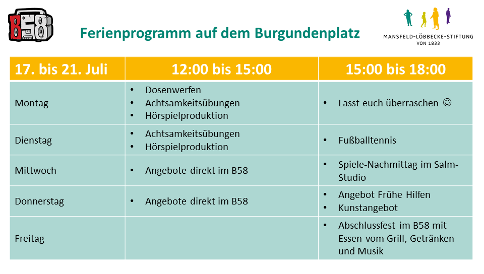 Pünktlich zum heutigen Start der Sommerferien in Niedersachsen präsentieren wir das diesjährige Ferienprogramm auf dem Braunschweiger Burgundenplatz im Siegfriedviertel. Ab dem 10. Juli finden täglich von 12 bis 18 Uhr unterschiedlichste Angebote statt. Bei Getränken, Gegrilltem und musikalischer Untermalung findet das zweiwöchige Ferienprogramm einen gemeinsamen Abschluss am 21. Juli in großer Runde im Jugendzentrum B58. Das komplette Programm finden Sie untenstehend.