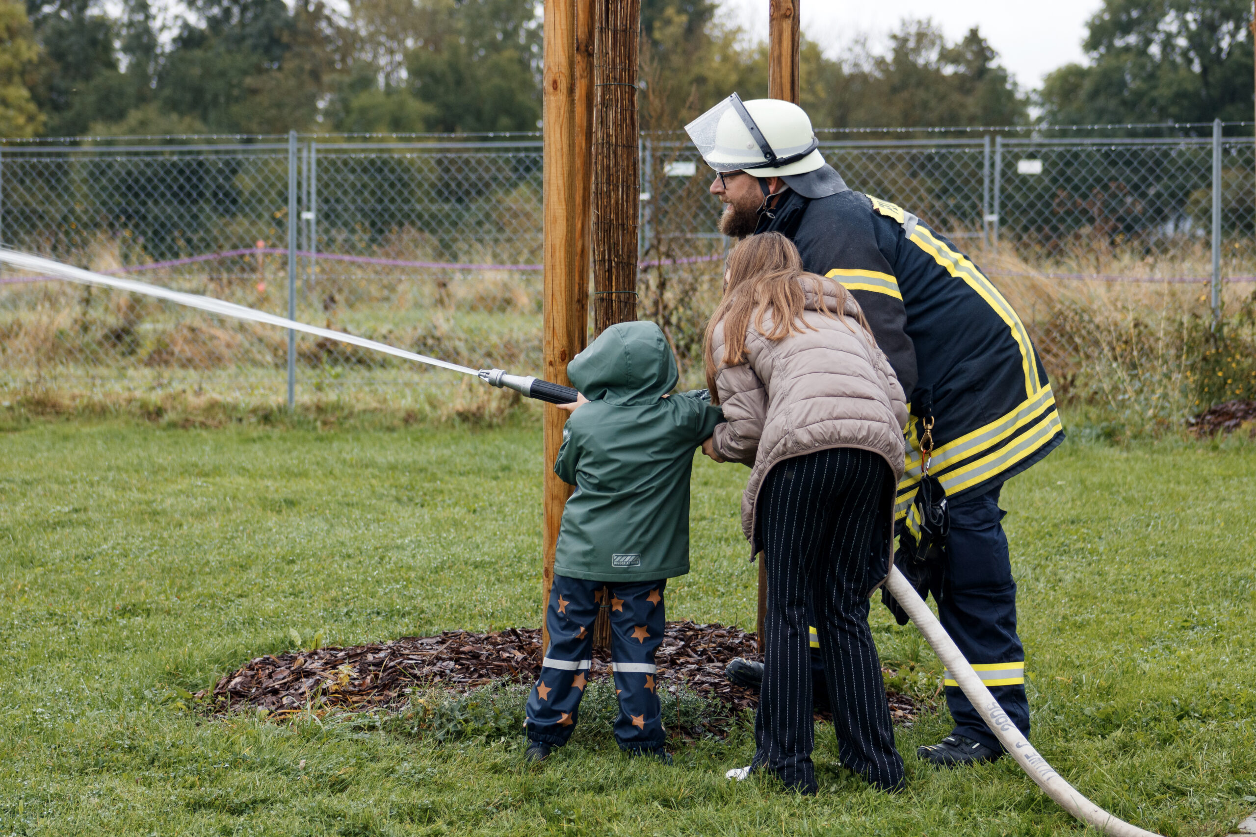 Mit großen Augen folgen die Kinder den Einsatzfahrzeugen der Feuerwehr, die mit Blaulicht auf den Hof fahren. Zwölf Feuerwehrmänner und –frauen springen in voller Montur heraus, laden Schläuche und allerhand Ausrüstung aus und beginnen mit dem Aufbau von Löschstation und Slalomparcours.