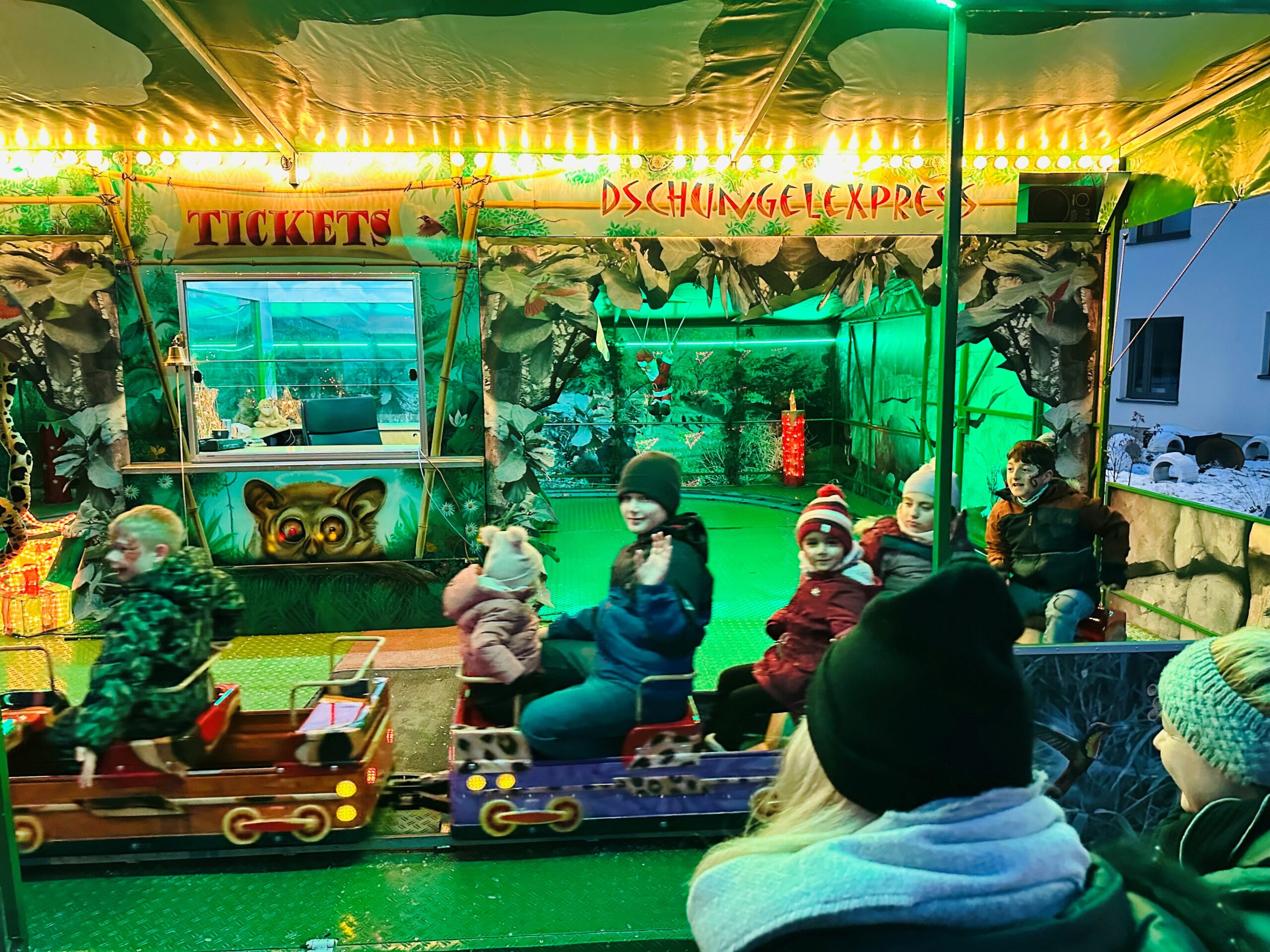 Ein Highlight des Weihnachtsmarktes war zweifellos die Kindereisenbahn, die ununterbrochen ihre Runden drehte. Die kleinen Fahrgäste konnten sich auf den bunten Waggons niederlassen und eine zauberhafte Fahrt durch die weihnachtlich geschmückte Kulisse genießen.
