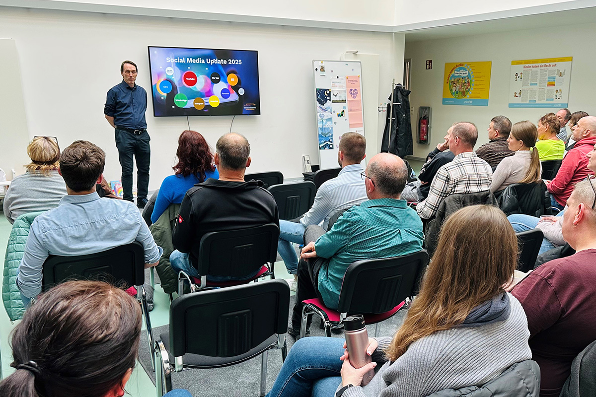Die Rückmeldungen aus den Workshops flossen am Nachmittag des zweiten Tages dann direkt in die Fortbildung für etwa 50 Mitarbeitende ein. Gleich zu Beginn stellte Bühler klar, dass Kinder und Jugendliche Erwachsene nicht als kompetente Ansprechpartner zum Thema Medien sehen würden: „Sie werden einfach nicht ernst genommen!“ Deshalb sei es um so wichtiger zu verstehen, was junge Menschen an Smartphone und Co. so fasziniert und was sie in den digitalen Welten erleben. So entwickelte sich ein lebhafter Austausch mit Lehrkräften und Betreuenden aus den Wohnangeboten. Peter Lüdtke sprach sich für Zugangsbeschränkungen zu Sozialen Medien nach australischem Vorbild aus und fragte: „Gibt es dazu auch Überlegungen in Europa?“ Solche Debatten würden derzeit weniger in der Politik geführt, erklärte Bühler: „Die werden vor allem von Elternverbänden angestoßen, zum Beispiel zum Verbot von Smartphones in der Schule.“