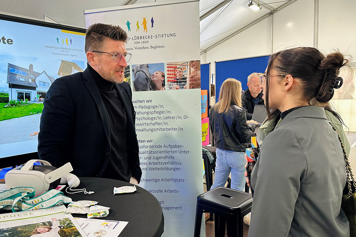 So auch am Stand der Mansfeld-Löbbecke-Stiftung: Daniel Kiene und Till Ruhe begrüßten Studierende der Sozialen Arbeit, informierten über die vielfältigen Einsatzmöglichkeiten beim Jugendhilfeträger und ermöglichten mittels VR-Brille den direkten Blick in ein Wohnangebot für Kinder.