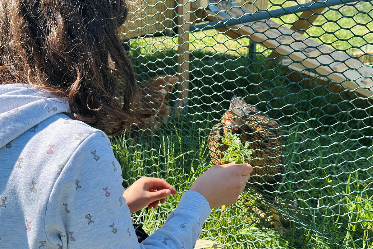 Auf dem großzügigen Gelände leben zudem übrigens vier glückliche Hühner, die nicht nur frische Eier liefern, sondern ebenfalls für viel Spaß und Lernmöglichkeiten sorgen. Die Kinder kümmern sich liebevoll um die Tiere – sie füttern, reinigen den mobilen Stall und verfolgen gespannt das tägliche Treiben.